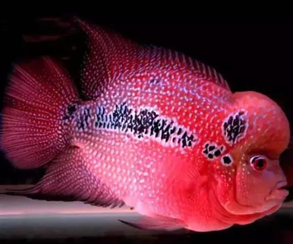 罗汉鱼 德萨斯罗汉鱼是这些品系中最好辨认的,德萨斯是在原种大型鲷鱼(德州豹)杂交改良而来的豹系金花罗汉鱼。这一类罗汉鱼品种现如今在市场上并不多见,而且价格也较高。德萨斯品系鱼体长一般在20~30厘米,额珠较低有前探趋势,无额斑;平眼,眼色以蓝色、金色为主;平嘴;背鳍、臀鳍不拉丝或有短小拉丝;后三鳍形成的夹角较小,尾鳍呈扇形;体形比较扁,体幅宽阔,椭圆形,背部较高,有青色小点和斑纹。性成熟时则由青色斑点变为红色珍珠斑纹,闪闪发光,十分耀眼。