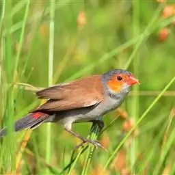 橙颊梅花雀体长约10厘米,头部灰色,两侧有大块橙色区域,嘴基及眼下方有黑纹,两条黑纹间呈白色,…