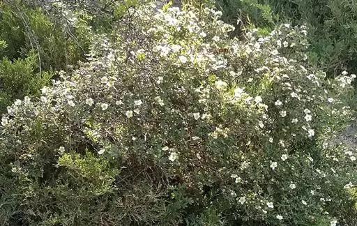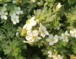 银露梅(学名:Potentilla glabra Lodd.)是蔷薇科,委陵菜属灌木,高可达2米,树皮纵向剥落。小枝红褐色,羽状复叶,叶柄被绢毛或疏柔毛;小叶片长圆形、倒卵长圆形或卵状披针形,两面绿色,托叶薄膜质,单花或数朵生于枝顶,花梗密被长柔毛或绢毛;萼片卵圆形,顶端急尖至短渐尖,花瓣白色,宽倒卵形,顶端圆钝,比萼片长;花柱近基生,瘦果褐棕色近卵形,6-11月开花结果。