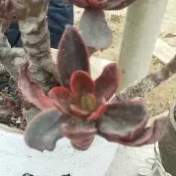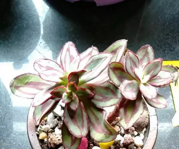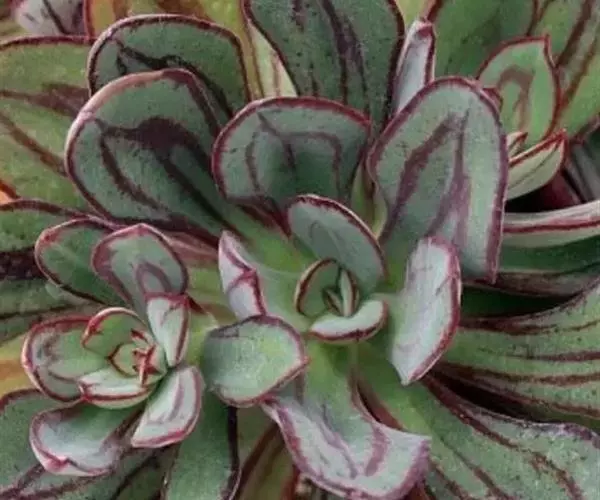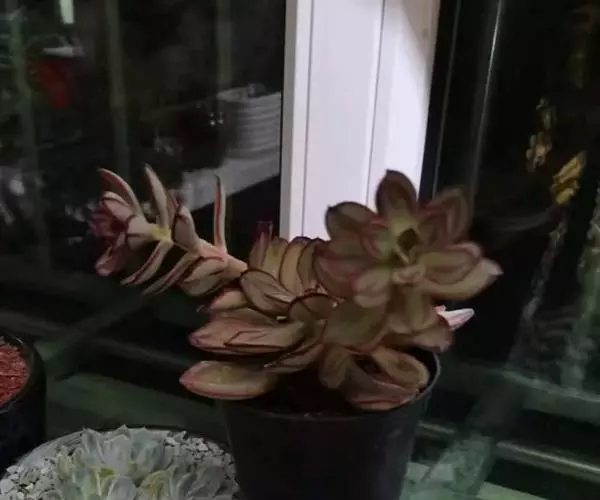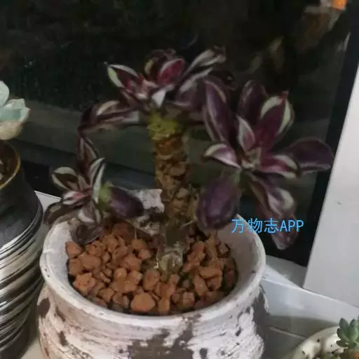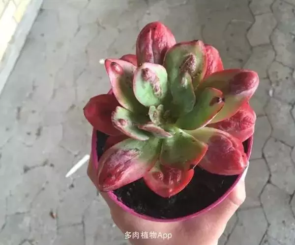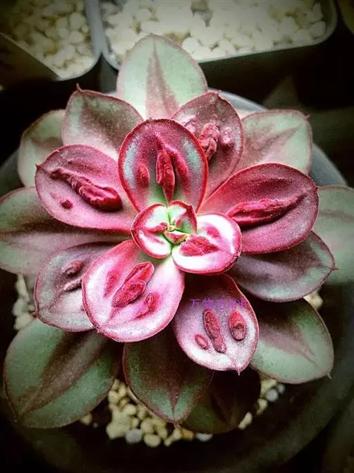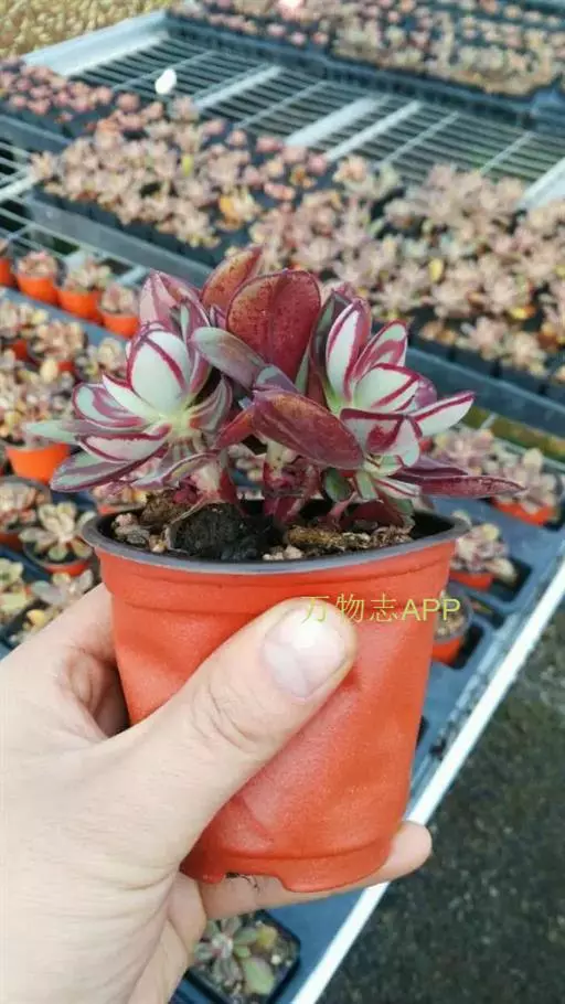 红司,多肉植物(肉质草本植物),景天科,拟石莲花属。有着非常特别的红色花纹叶片,且叶片边缘也呈现红色,叶片背部有红色花纹或片状红色斑点,植株茎干有很多不规则棱角。光照不足的情况下,叶片会逐渐变绿色,但少有植株全绿。