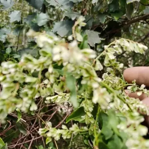 花:花序圆锥状,顶生或腋生,长10-20厘米,分枝开展,具细纵棱,沿 何首乌图 棱密被小突起;苞片三角状卵形,具小突起,顶端尖,每苞内具2-4花;花梗细弱,长2-3毫米,下部具关节,果时延长;花被5,深裂,白色或淡绿色,花被片椭圆形,大小不相等,外面3片较大背部具翅,果时增大,花被果时外形近圆形,直径6-7毫米;雄蕊8,花丝下部较宽;花柱3,极短,柱头头状。