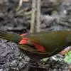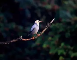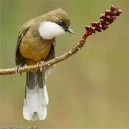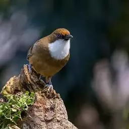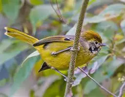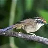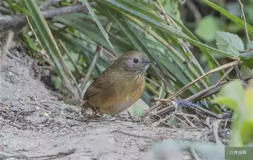 白腹幽鹛,体小(14厘米)的暖褐色鹛。全长约150毫米。上体橄榄褐色;眼先污褐灰;颏、喉白色,具黑色矢形斑;胸具淡棕橄榄色宽阔带斑;腹部中央白色。与棕胸雅鹛及雀鹛的区别在尾短而较圆。虹膜-红褐;嘴-带黑;脚-肉褐色。常栖息于海拔1000-1500米的山林间,并随着季节而垂直迁徙,夏季至高山,冬季至平原,常栖于竹林、灌丛。分布于云南西部(留鸟) 。