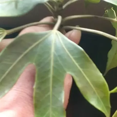 变叶树参 直立灌木,高2-3米。叶片革质、纸质或薄纸质,无腺点,叶形变异很大,不分裂叶片椭圆形、卵状椭圆形、椭圆状披针形、长圆状披针形以至线状披针形或狭披针形,长2.5-12厘米,有时更大,宽1-7厘米,先端渐尖或长渐尖,稀急尖,基部楔形或阔楔形,有时钝形,分裂叶片倒三角形,掌状2-3深裂,两面均无毛,边缘近先端处有细齿2-3个,有时中部以上全部有细齿,全缘的较少,基脉三出,有时不明显,中脉隆起,侧脉5-9对,稀多至15对以上,上面微隆起,下面稍明显至明显,网脉不明显;叶柄长0.5-5厘米,无毛。伞形花序单生或2-3个聚生,有花十数朵至数十朵或更多;总花梗粗壮,长0.5-2厘米;花梗长0.5-1.5厘米;花一般长3毫米,充分发育的可达5毫米以上;萼长约2毫米,边缘有4-5个小齿;花瓣4-5,卵状三角形,长1.5-2毫米;雄蕊与花瓣同数,花丝甚短;子房4-5室;花柱合生成短柱状,长不及1毫米。果实球形,平滑,直径5-6毫米,宿存花柱长1-1.5毫米。花期8-9月,果期9-10月。