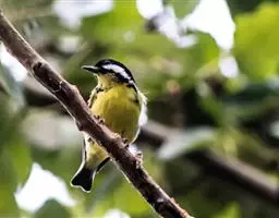 描述:体小(13厘米)的山雀。白色眉纹显著,头顶及胸兜黑色;前额的白色后延而成白色的长眉纹;头侧、两胁及腹部黄褐;臀皮黄色;上体深灰沾橄榄色。与红腹山雀的区别在无白色脸颊且栖于少林木的生境。