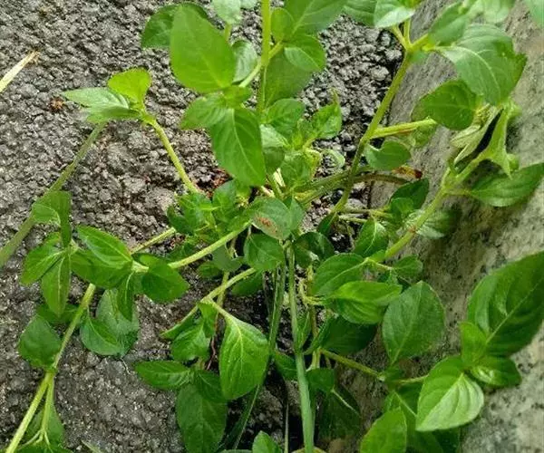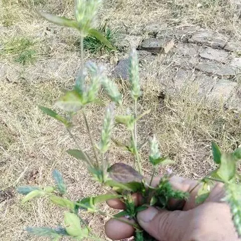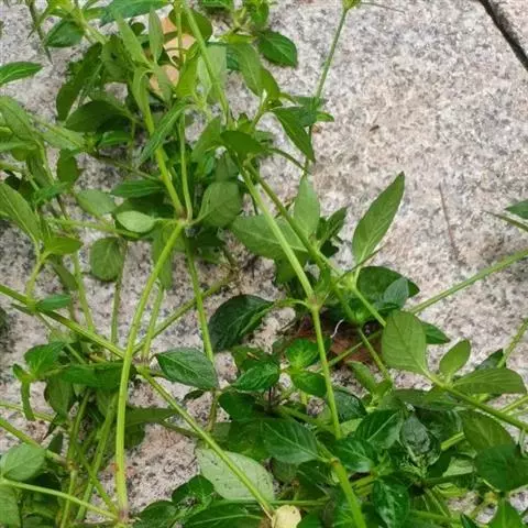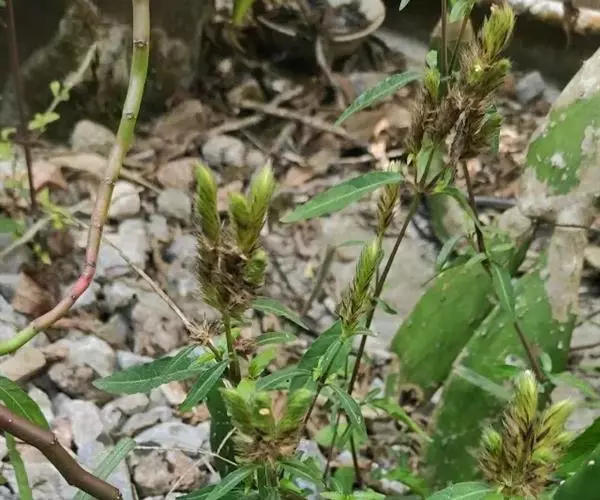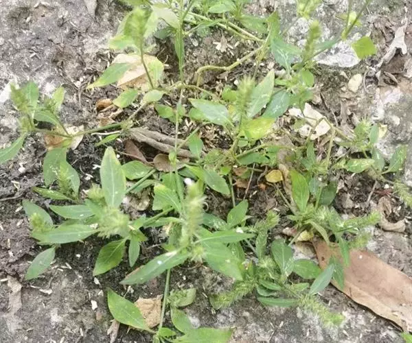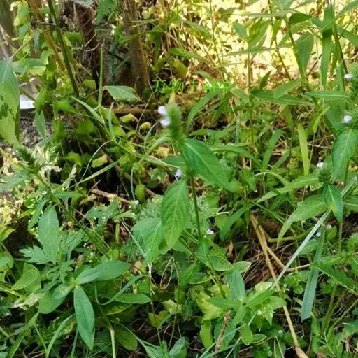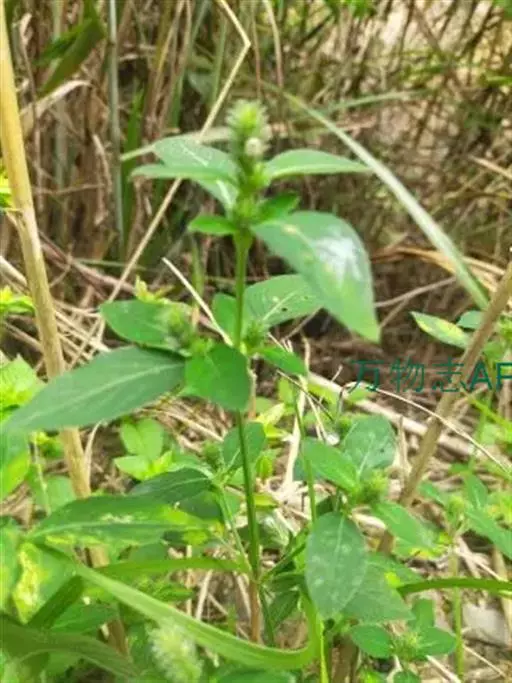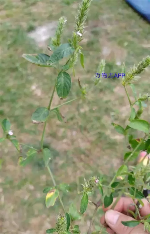 全草长10~60cm。根细而弯曲。茎具纵棱,直径2~4mm,基部节上常有不定根;表面黄绿色;被毛,节膨大成膝状;质脆,易折断,断面可见白色的髓。叶对生,具柄;叶片多皱缩,展平后呈卵形或狼状披针形,两面及叶缘有毛。穗状花序顶生或腋生、苞片及宿存花萼均被粗毛;偶见花冠,淡红色。蒴果棒状,长约6mm。种子4颗,黑褐色,扁三角形。气微,味淡。以茎叶色绿者为佳。