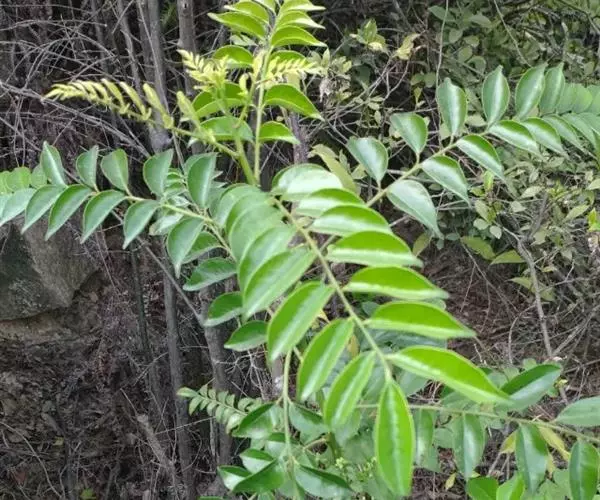 幼龄植株呈直立灌木状,其小枝细长而披垂,成龄植株攀援于它树上,枝干有短沟刺,叶轴上的刺较多。叶有小叶5—25片,近花序的叶有小叶较少,萌发枝上的叶有小叶较多;小叶互生或位于叶轴上部的对生,卵形,卵状椭圆形或斜长圆形,长4—10厘米,宽1.5—4厘米,稀较小,顶部短尖至长尾状尖,或突急尖至长渐尖,顶端常钝头且微凹缺,凹口处有一油点,基部短尖或宽楔形,或一侧近于圆,另一侧楔尖,两侧明显不对称或近于对称,全缘或叶缘的上半段有细裂齿,干后乌黑或黑褐色,叶面有光泽或老叶暗淡无光,中脉至少下半段凹陷且无毛,或有灰色粉末状微柔毛,则中脉近于平坦且叶有小叶较少,通常5—11片,质地也较厚而稍硬,油点不显,或少且小,仅在扩大镜下可见。花序腋生或兼有顶生;萼片及花瓣均4片;萼片淡紫绿色,宽卵形,长约1/2毫米;花瓣淡黄绿色,长2—3毫米;雄花的雄蕊4枚,长3—4毫米,药隔顶部有1油点;退化雌蕊半圆形垫状凸起,花柱2—4裂;雌花有心皮4或3个;退化雄蕊鳞片状。分果瓣紫红色,干后灰褐色或乌黑色,径4.5—55毫米,顶端有短芒尖,油点通常不甚明显,平或稍凸起,有时凹陷;种子近圆球形,两端微尖,径4—5毫米。花期3—5月,果期7—8月。