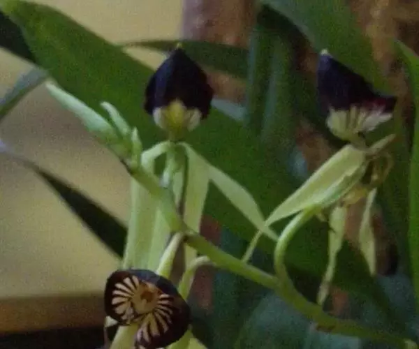多年生附生兰。株高15-30厘米,假鳞茎扁椭圆形,总状花序,自假鳞茎叶片着生处抽出,直立,花茎长25-30厘米,散生花10-15朵,由下向上逐次开放,花径5-7厘米,有香气,唇瓣长在正上方,略内弯,前部黄绿色带紫褐色粗条纹,两侧深紫色,基部白色,褶片黄色;蕊柱黄绿色带紫色斑块,与唇瓣不全部合生;花瓣和粤片黄绿色,无斑,线形,近等,均反折至唇瓣下方,自然下垂,稍有扭曲。花期夏秋季,单花花期可达25-30天。