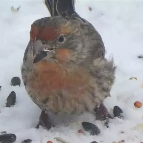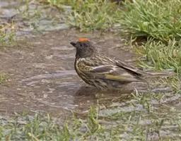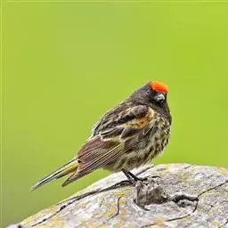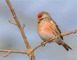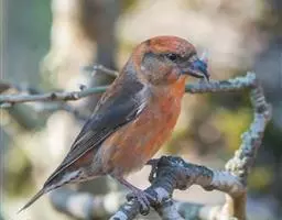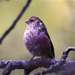 红腰朱雀:体长12-14厘米,小型鸟类。雄鸟前额和眉纹玫瑰粉红色,头顶和一宽的贯眼带深红褐色,背红…
