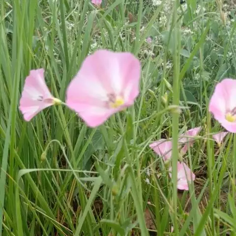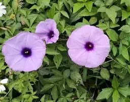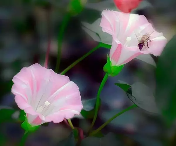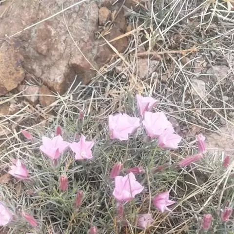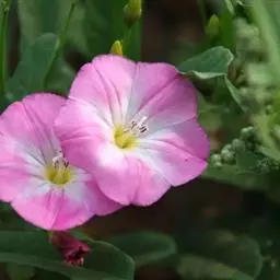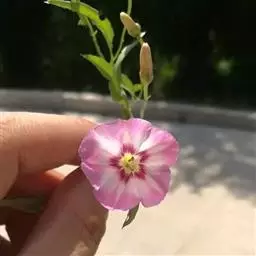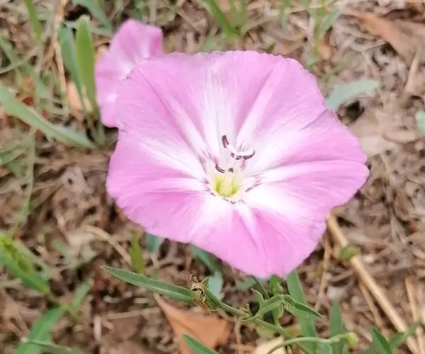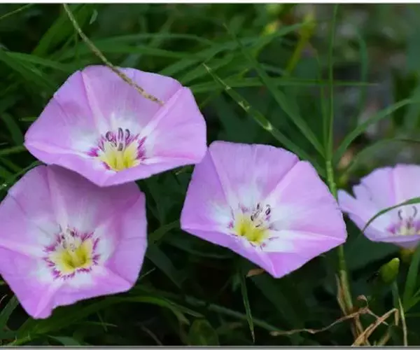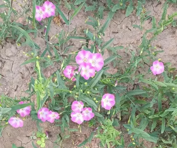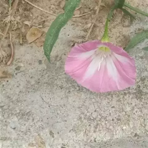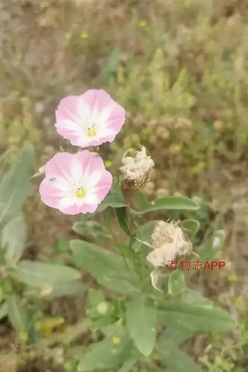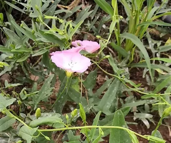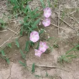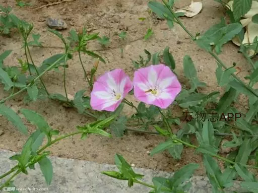 田旋花,多年生草质藤本,近无毛。根状茎横走。茎平卧或缠绕,有棱。叶柄长1~2厘米;叶片戟形或箭形,长2.5~6厘米,宽1~3.5厘米,全缘或3裂,先端近圆或微尖,有小突尖头;中裂片卵状椭圆形 、狭三角形、披针状椭圆形或线性;侧裂片开展或呈耳形。花1~3朵腋生;花梗细弱;苞片线性,与萼远离;萼片倒卵状圆形,无毛或被疏毛;缘膜质;花冠漏斗形,粉红色、白色,长约2厘米,外面有柔毛,褶上无毛,有不明显的5浅裂;雄蕊的花丝基部肿大,有小鳞毛;子房2室,有毛,柱头2,狭长。蒴果球形或圆锥状,无毛;种子椭圆形,无毛。花期5~8月,果期7~9月。