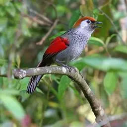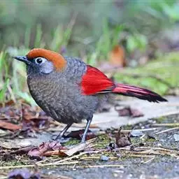 赤尾噪鹛中型鸟类,体长24~28厘米。头顶至后颈红棕色,两翅和尾鲜红色,眼先、眉纹、颊、颏和喉黑色,…