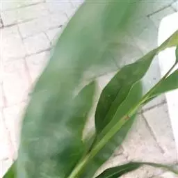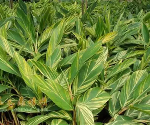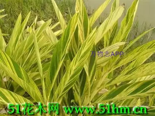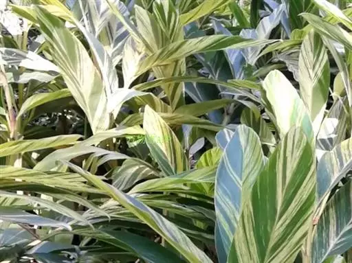 花叶良姜植株高可达1~2m,盆栽高度多在1米以下,具 根茎。革质叶片具鞘,长椭圆形,两端渐尖,叶长约50~60cm,宽约15~20cm,叶面深绿色,有金黄色富有光泽的纵斑纹,十分艳丽。