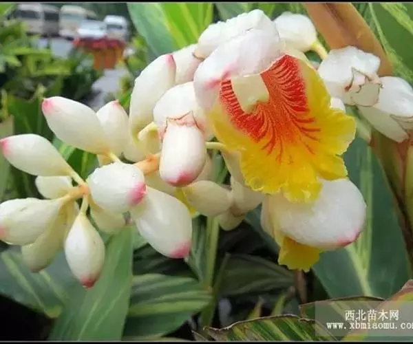夏季6~7月开花,圆锥形花序,花序下垂,花蕾包藏于总苞片中,花白色,边缘黄色,顶端红色,唇瓣广展,花萼近钟形,花冠白色,花期夏季。