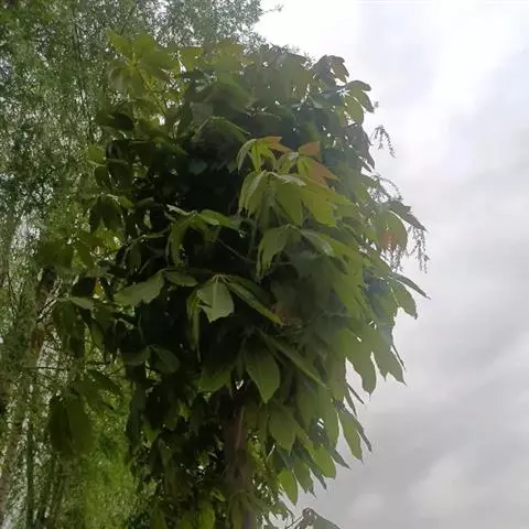 长柄七叶树,是双子叶植物纲、七叶树科、七叶树属落叶乔木,树皮灰褐色,无毛,掌状复叶,叶柄长,小叶较厚,近于革质,花序顶生,细长圆筒形,花杂性,花萼管状,花丝细瘦,花药长圆形,蒴鰠倒卵圆形或近于椭圆形。