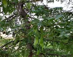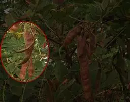 栗豆树属于中乔木,为奇数羽状复叶、小叶互生,叶形为披针状长椭圆形,长约8~12公分,全缘、革质。荚果长达20公分,种子(也就是绿元宝)为椭圆形,大如鸡蛋,可供烤食。