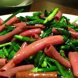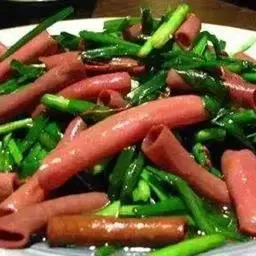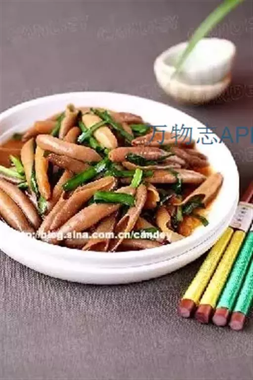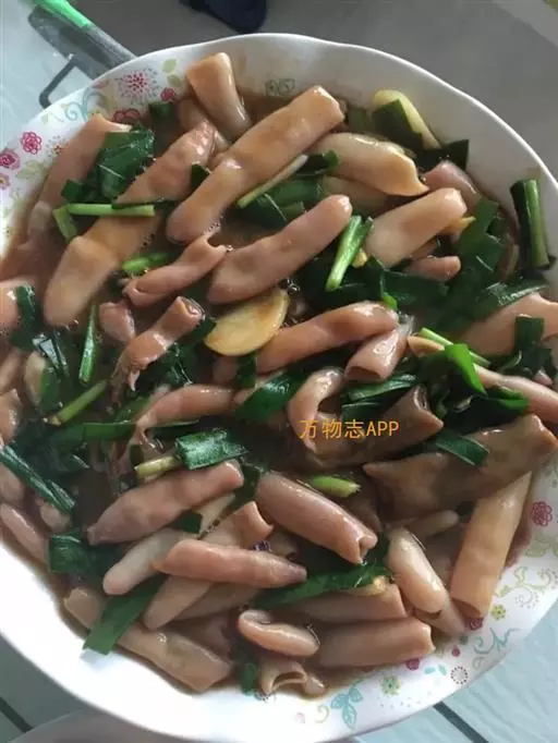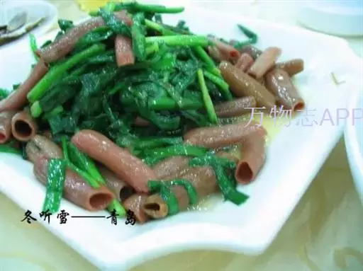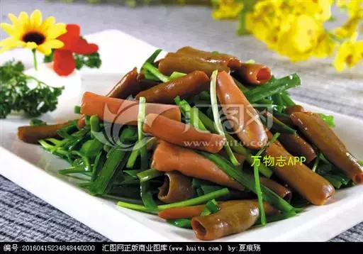 要材料,烹饪以拌菜为主。特色:海肠清脆鲜红,韭菜脆嫩鲜绿,红绿相间,顺色顺味。