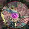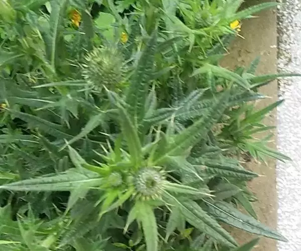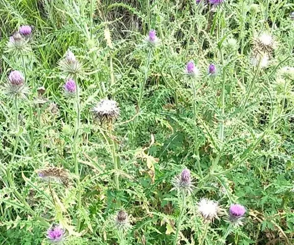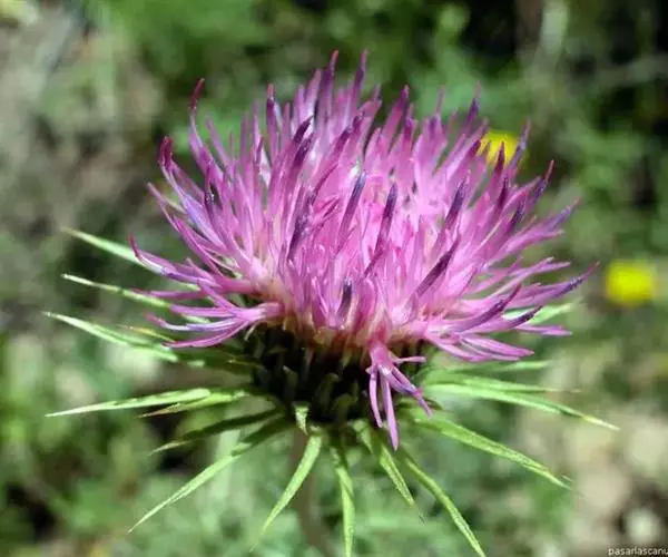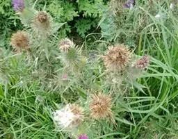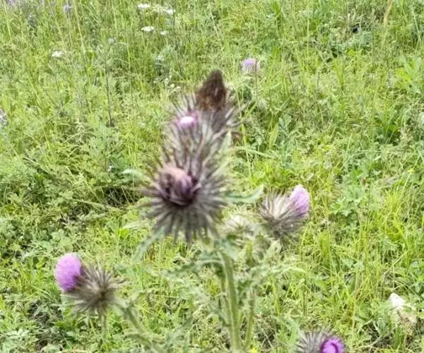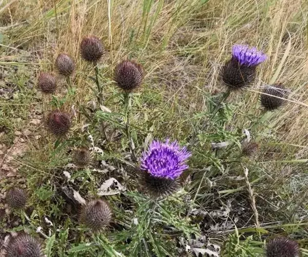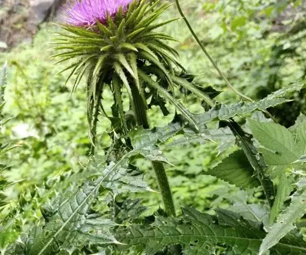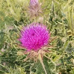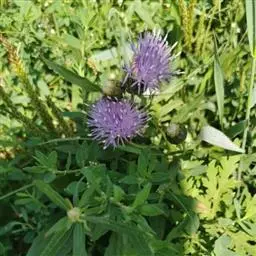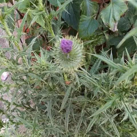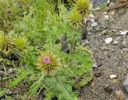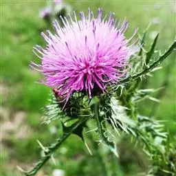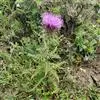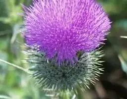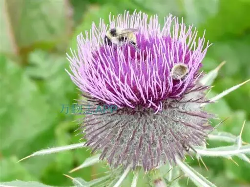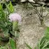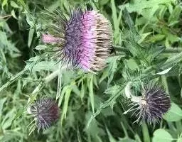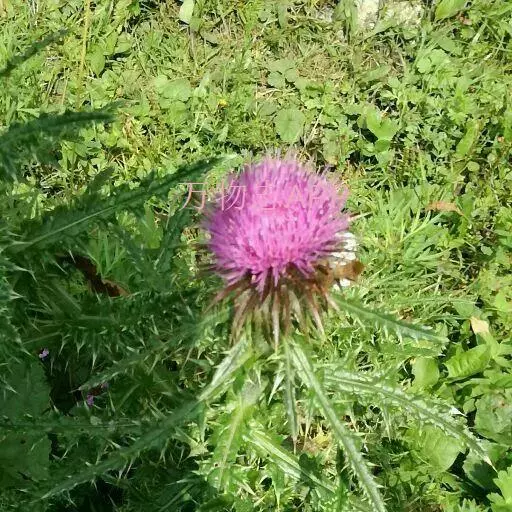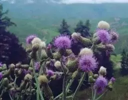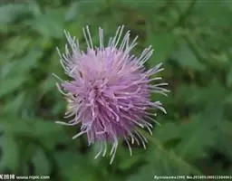 魁蓟,菊科, 蓟属;头状花序单生枝端,直立,总苞宽钟状,有蛛丝状毛。总苞片线装披针形,边缘有小刺,顶端成长尖刺。花冠紫色,长2. 5厘米,管状花的下部狭管部与具裂片的檐部近等长。花期7-9月。