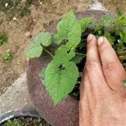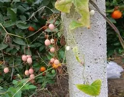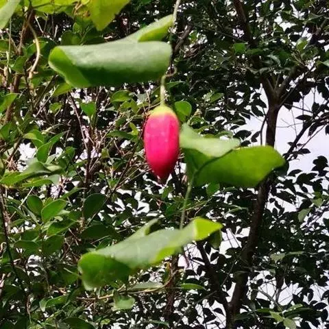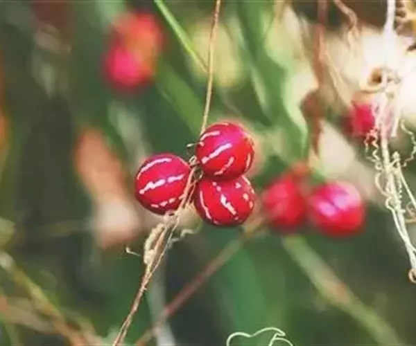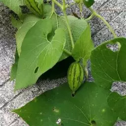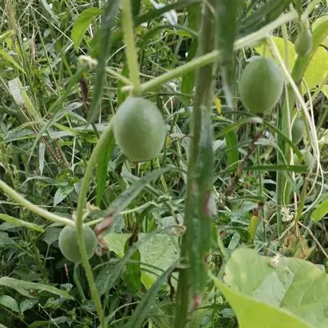 毒瓜 攀援草本;根块状;茎纤细,疏散,有明显的棱沟,光滑无毛。卷须纤细,2歧,无毛。叶柄粗糙,有棱沟,长4-6厘米,被疏散的柔毛;叶片膜质,轮廓宽卵圆形,长、宽均为8-12厘米,掌状5深裂,中间的裂片较长,长圆状披针形,长8-10厘米,宽2-3.5厘米,先端渐尖或钝圆,边缘有疏齿或呈波状,侧面的裂片较短,披针形或长圆状披针形,边缘有齿,基部的2裂片有时具不规则2-3浅裂,叶片基部的弯缺圆形或方形,深0.5-1.5厘米,宽2-2.5厘米,两面粗糙,上面深绿色,背面苍绿色,除脉上明显被柔毛外,近无毛。雌雄同株,雌、雄花常各数朵簇生在同一叶脉。雄花:花梗细,长0.5-1.5厘米,无毛,花萼筒短,长约2毫米,宽5-6毫米,裂片开展,钻形,长约0.5-1毫米;花冠绿黄色,径约7毫米,裂片卵形,长2毫米,宽约0.5-1毫米,先端稍钝,具明显3条脉,两面具小疣点;雄蕊3,1枚1室,2枚2室,花丝离生,极短,长1-1.5毫米,花药卵形,长2毫米,药室折曲。雌花:花萼和花冠与雄花相同;子房卵球形,平滑,近无毛,花柱细,上部3裂,柱头膨大,2裂。果实近无柄,球形,不开裂,直径14-18毫米,果皮平滑,黄绿色至红色,并间以白色纵条纹。种子少数,卵形,褐色,两面凸起,凸起部份厚达1-2毫米,环以隆起的环带,长5毫米,宽3毫米,厚3.5-4毫米。花期3-8月,果期7-12月。 [1-2]
