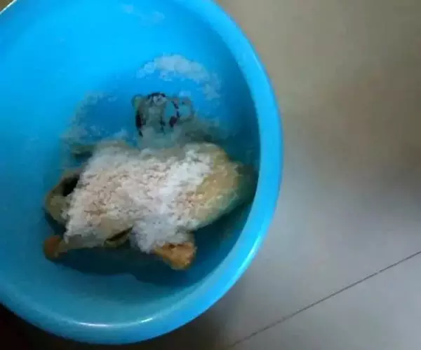 用0.5mg/L的强氯精全池泼洒。