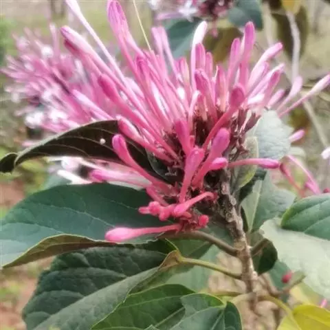 房状聚伞花序顶生,密集;苞片叶状,披针形或卵状披针形,长约3厘米,早落或花时不落,早落后在花序梗上残留凸起的痕迹,小苞片披针形,长约1.8厘米;花萼钟状,长2-6毫米,被短柔毛及少数盘状腺体,萼齿三角形或狭三角形,长1-3毫米;花冠淡红色、红色或紫红色,花冠管长2-3厘米,裂片倒卵形,长5-8毫米;雄蕊及花柱均突出花冠外;花柱短于、等于或稍长于雄蕊;柱头2裂,子房4室。核果近球形,径0.6-1.2厘米,成熟时蓝黑色。花果期5-11月。