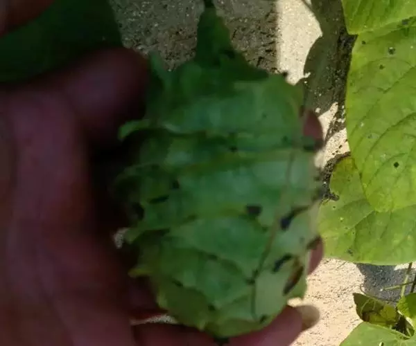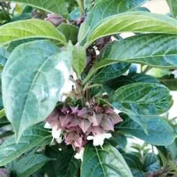 灌木,高1-2米,植株有臭味;花序轴、叶柄密被褐色、黄褐色或紫色脱落性的柔毛;小枝近圆形,皮孔显著。叶对生,叶片纸质,宽卵形或卵形,长8-20厘米,宽5-15厘米,顶端尖或渐尖,基部宽楔形、截形或心形,边缘具粗或细锯齿,侧脉4-6对,表面散生短柔毛,背面疏生短柔毛和散生腺点或无毛,基部脉腋有数个盘状腺体;叶柄长4-17厘米。