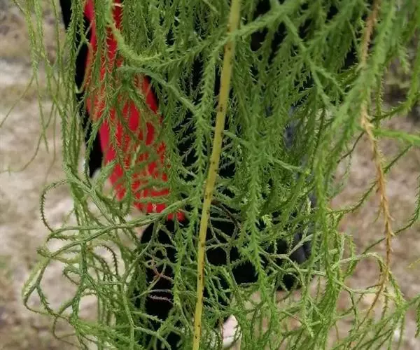 大型土生植物。地下茎长而匍匐。地上主茎木质藤状,伸长攀援达数米,圆柱形,直径约2毫米,具疏叶;叶螺旋状排列,贴生,卵状披针形至钻形,长1.5-3.0毫米,宽约0.5毫米,基部突出,弧形,无柄,先端渐尖,具1膜质,长2-5毫米的长芒或芒脱落。不育枝柔软,黄绿色,圆柱状,枝连叶宽约4毫米,多回不等位二叉分枝;叶螺旋状排列,但叶基扭曲使小枝呈扁平状,密生,上斜,钻状,上弯,长2-3毫米,宽约0.5毫米,基部下延,无柄,先端渐尖,具长芒,边缘全缘,背部弧形,腹部有凹槽,无光泽,中脉不明显,草质。能育枝柔软,红棕色,小枝扁平,多回二叉分枝;叶螺旋状排列,稀疏,贴生,鳞片状,长约0.8毫米,宽约0.3毫米,基部下延,无柄,先端渐尖,具芒,边缘全缘;苞片形同主茎,仅略小;孢子囊穗每6-26个一组生于多回二叉分枝的孢子枝顶端,排列成圆锥形,具直立的总柄和小柄,弯曲,长1-4厘米,直径2-3毫米,红棕色;孢子叶阔卵形,覆瓦状排列,长2-3毫米,宽约1.5毫米,先端急尖,具膜质长芒,边缘具不规则钝齿,厚膜质;孢子囊生于孢子叶腋,内藏,圆肾形,黄色。