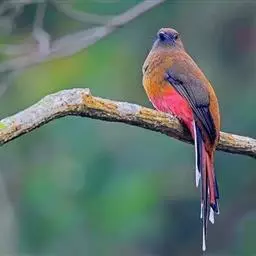 雄鸟全长约140厘米,雌鸟约60厘米。雄鸟头顶、背、胸为金属翠绿色;羽冠紫红色;后颈披肩羽白色,具黑色羽缘;下背棕色,腰转朱红色。飞羽暗褐色。尾羽长,有黑白相间的云状斑纹。腹部白色。嘴和脚蓝灰色。雌鸟上体及尾大部棕褐色,缀满黑斑。胸部棕色具黑斑。