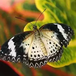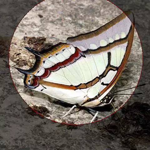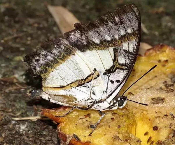 翅面乳白色,前翅面亚外缘有2列黄白斑,中室端外有2个斑;后翅亚外缘有2列黑斑,臀角淡黄色,内侧有2个黑斑。翅反面中横带外侧有新月形黑斑列,基横带两侧黑边粗,前翅中室内和端脉外各有2个黑点。
