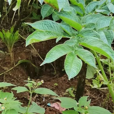 多年生草本。株高30厘米-40厘米,无茎或茎短小,具块茎或伸长的根茎,有时茎变厚而木质。叶基生,叶长椭圆状披针形,两端渐尖,叶脉明显,叶柄长,深绿色,基部呈鞘状,叶全缘或有分裂。