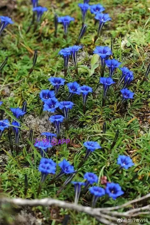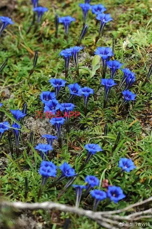 蓝玉簪龙胆(学名:Gentiana veitchiorum Hemsl.)多年生草本,高5-10厘米。根略肉质。花枝多数丛生,黄绿色。叶先端边缘粗糙,叶脉在两面均不明显或仅中脉在下面明显;莲座丛叶发达,线状披针形,花单生枝顶,下部包围于上部叶丛中;无花梗;花萼长为花冠的1/3-1/2,萼筒常带紫红色,筒形,长1.2-1.4厘米,裂片与上部叶同形,花冠上部深蓝色,下部黄绿色。蒴果内藏,椭圆形,先端渐狭,基部钝,柄细;种子黄褐色,有光泽,矩圆形,表面具蜂窝状网隙。花果期6-10月。