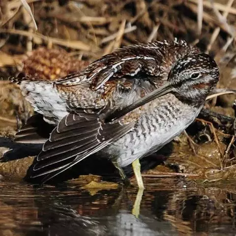 孤沙锥(学名:Gallinago solitaria): 是鸟纲、鹬科的小型涉禽。体重126-159克,体长265-318毫米。为沙锥中个体最大者。嘴长而直、灰褐色,脚短、土黄色,两眼位于头侧稍靠后。头顶的中央冠纹和眉纹白色。上体赤褐色,背具4条白色纵带。尾具黑色横斑和宽阔的棕红色次端斑。胸淡黄褐色,喉和腹白色。两胁、腋羽和翼下覆羽白色而具密集的黑褐色横斑,飞翔时极明显,飞翔时显得慢而笨重。