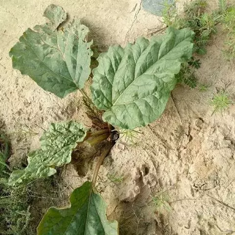药用大黄 多年生 高大草本,高1.5-2米,根及根状茎粗壮,内部黄色。茎粗壮,基部直径2-4厘米,中空,具细沟棱,被白色短毛,上部及节部较密。