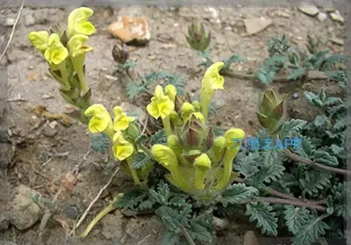 花萼开花时长2毫米,盾片高1.5毫米,均被长柔毛,杂有具柄腺毛,果时花萼长4毫米,盾片高约4毫米。花冠长约2.5-3.3厘米,黄色,或在上唇及下唇侧裂片处带紫,外被疏柔毛及具柄短腺毛;冠筒基部微囊大,宽约1.5毫米,中部以上渐宽,至喉部宽达7毫米;冠檐2唇形,上唇盔状,先端微缺,下唇中裂片宽卵圆形,先端微缺,2侧裂片短小,卵圆形。雄蕊4,前对较长,具能育半药,后对较短,具全药,药室裂口具白色髯毛;花丝丝状,扁平,近无毛。