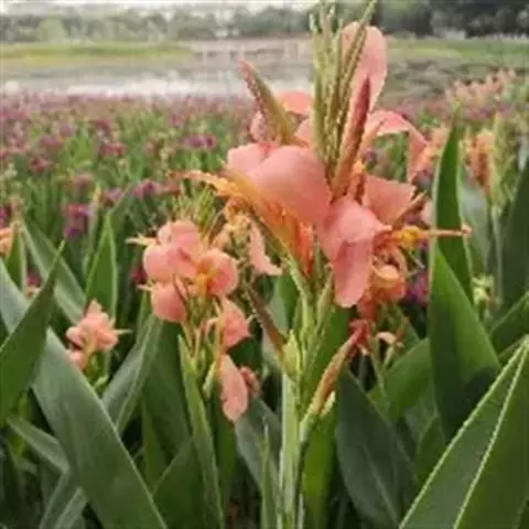 粉美人蕉:是一种球根草本植物。根茎延长,株高1.5-2米;茎绿色。叶片披针形;总状花序疏花,单生或…