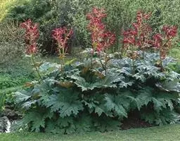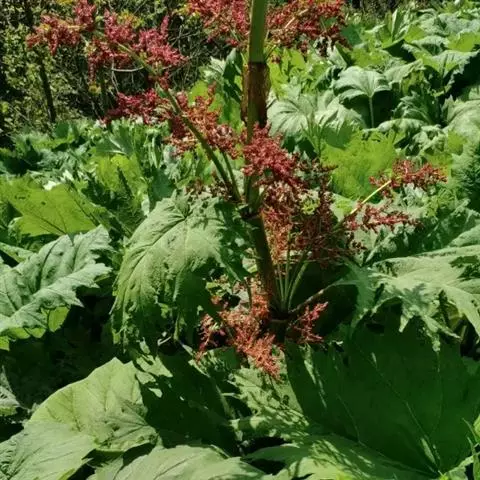 掌叶大黄蓼科,大黄属高大粗壮草本植物,高可达2米,粗壮木质根状茎。茎直立中空,叶片长宽近相等,基部…