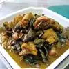 4、以少量热油爆香葱花及蒜茸,加高汤、生抽、糖、盐、茄子、土豆和青椒块略烧;