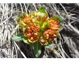 叶子表面宽厚,富肉质感且带有磨纱质感,看像石头质地;开红色小花,生于植株顶部,倒伞形密生,形状像花…