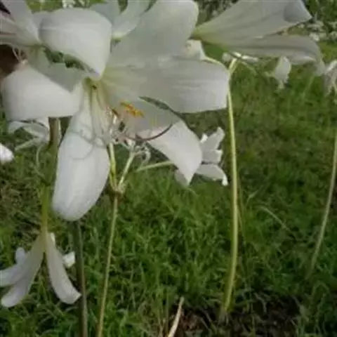 长筒石蒜草本,地生。鳞茎卵球形;叶披针形;伞形花序,有花5-7朵,花白色;花被裂片腹面稍有淡红色条纹,…