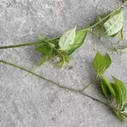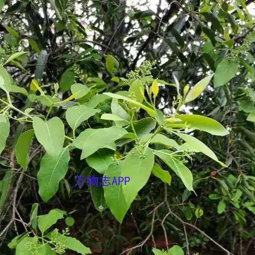 叶对生,叶椭圆状卵形,膜质,长4~8厘米,宽2~4厘米,先端急尖或近急尖,基部楔形或阔楔形,多少下延,边缘波状,稍外折,背面有白粉,无毛;中脉在背面凸起,侧脉约10对,网脉不明显;叶柄细长,长1~1.5厘米。