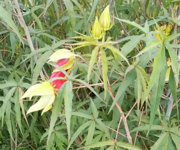 红秋葵为多年生直立草本,高1-3米,茎带白霜,无毛。叶指状5裂,裂片狭披针形,长6-14厘米,宽6-15毫米,先端锐尖,基部楔形,边缘具疏齿,两面均平滑无毛;叶柄长5-10厘米,平滑无毛。