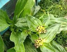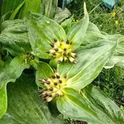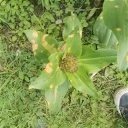 4、斑枯病:每年6月末到10月发病。此病是危害龙胆草严重的病害。患病叶片出现棕褐色圆形或椭圆形病斑,病斑中央颜色稍浅,边缘褐色,病斑两面处有黑小点,是病原菌的子实体分生孢子器,严重时病斑汇合,叶片枯死,最后导致整株枯萎。6月初至6月中旬用具65%代森锰锌400-500倍液每5-7天喷一次,从6月中旬至于10月用代森锰锌300倍液体3-5天喷一次。也可用于50%多菌灵400倍液体3-5天喷一次与代森锰锌交替使用。