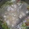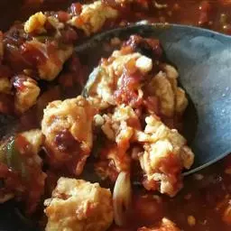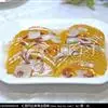 4、糖醋汁煮滚,埋芡,将上项材料回镬兜匀,淋在豆腐上。