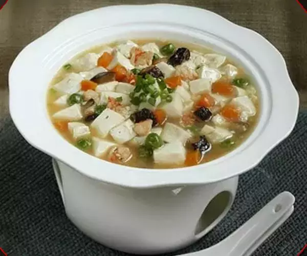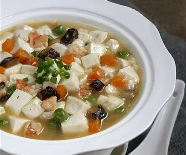 3、坐锅点火倒油,将切好的菜倒入炒香,冲少许清水,加黄酒、盐,放入豆腐丁略煮水淀粉勾芡,加味精、香油出锅,倒在蒸好的鸡蛋羹上,将虾仁炒散,撒在豆腐上即可。