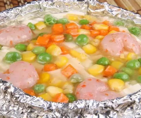 辅料:番茄50克,香菇(鲜)50克,青豆50克