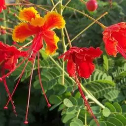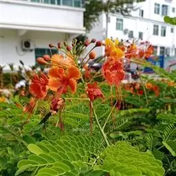 洋金凤 Sw.),豆科小凤花属灌木状或小乔木植物,枝无毛,绿或粉绿色;二回羽状复叶;总状花序伞房状,…