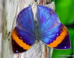 展翅宽45--90mm,平均在65--75mm.翅浓紫褐色,外缘有灰黄色宽边,内侧有7--8个蓝紫色的椭圆形纹排列成横列,前翅顶角附近有2个白色斜斑。翅反面黑褐色,有极密的黑色波状细纹,外缘黄白色。