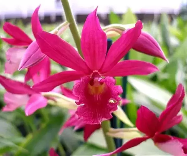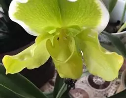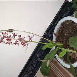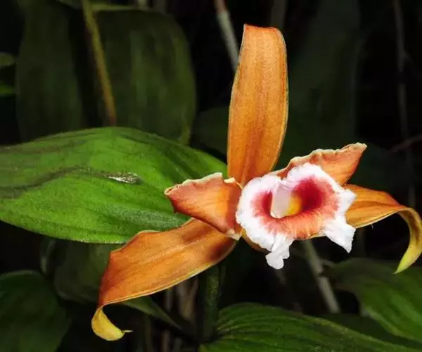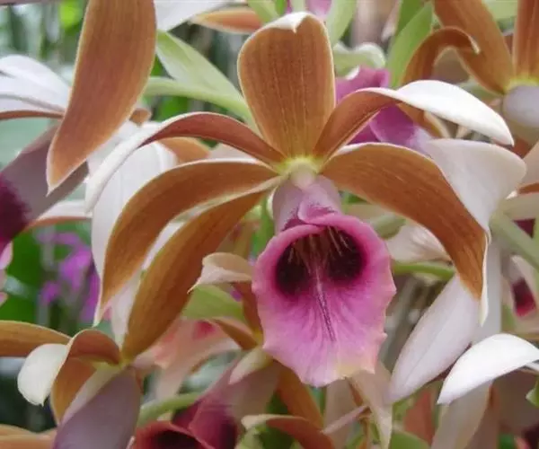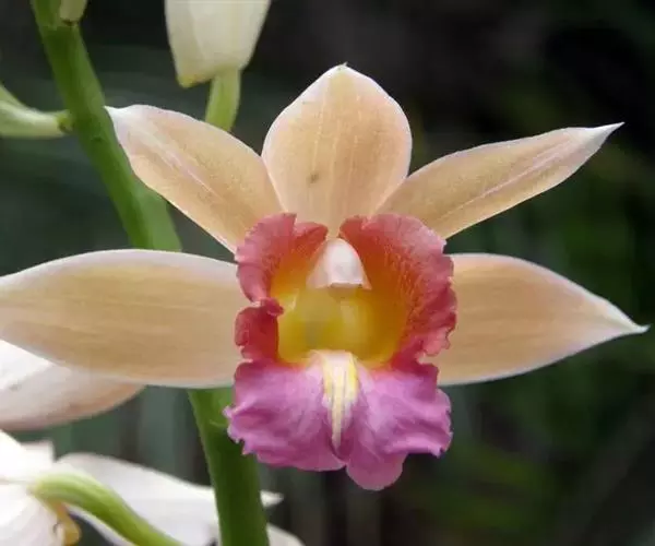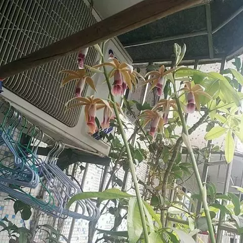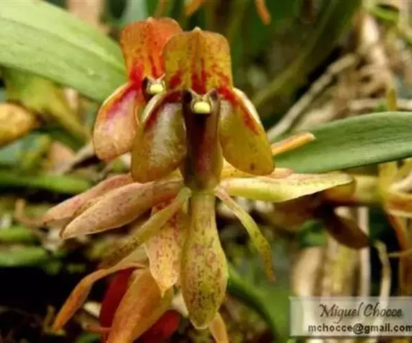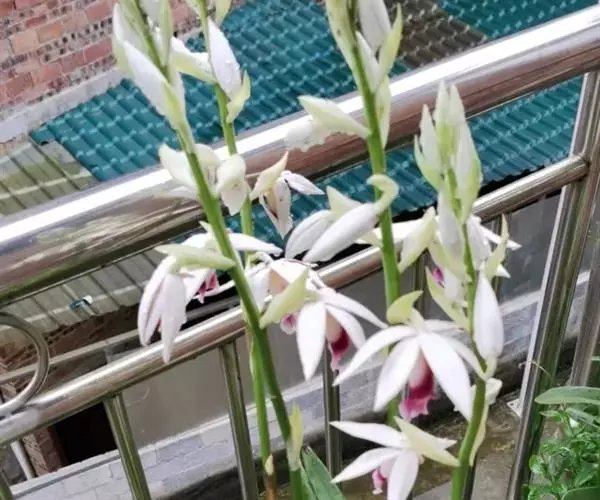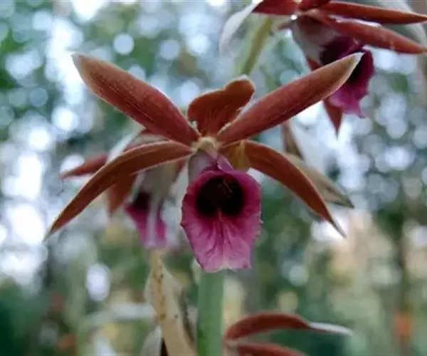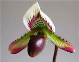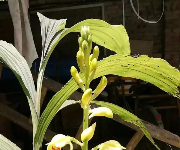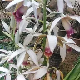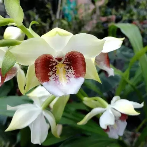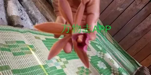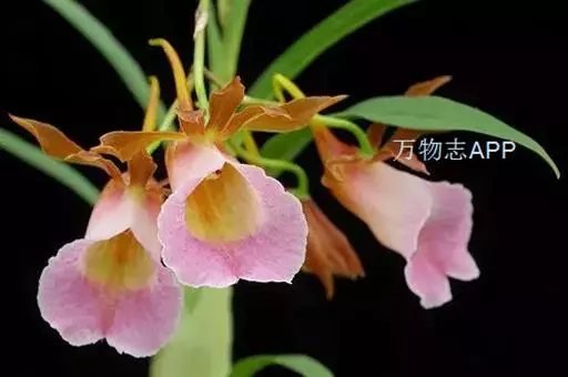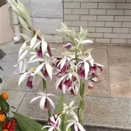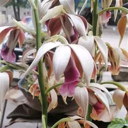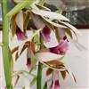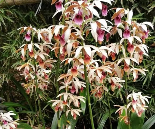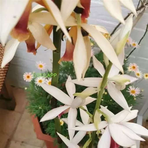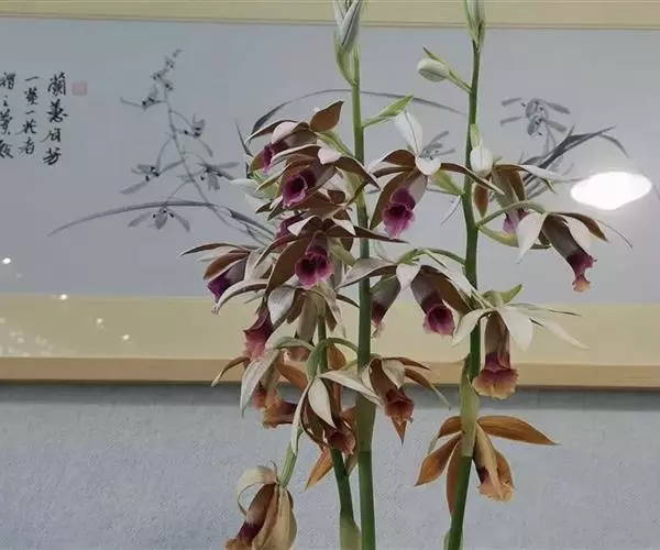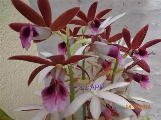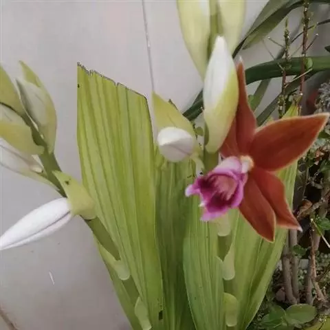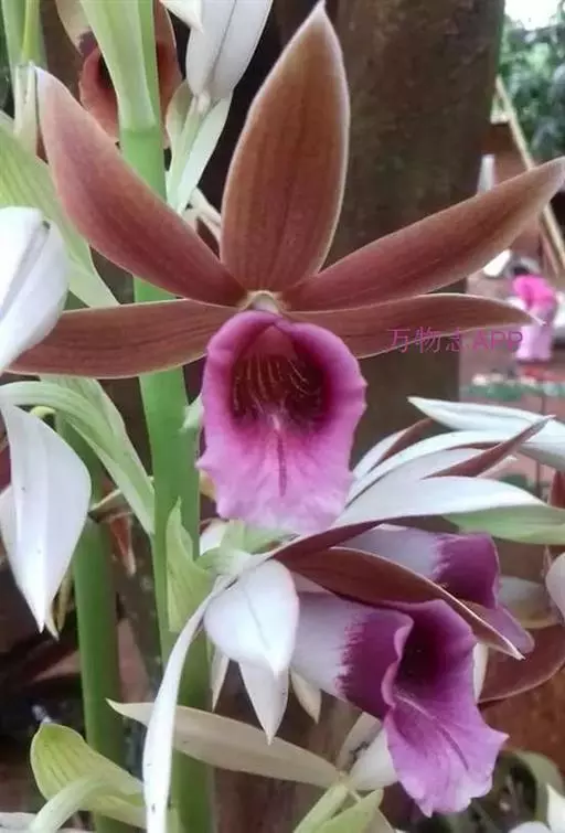 花葶从假鳞茎基部或叶腋发出,直立,圆柱形,长达1米,粗约1厘米,疏生数枚大型的鳞片状鞘,无毛;总状花序具多数花;花苞片大,膜质,通常早落,舟形,比花梗和子房长,先端急尖,无毛;花梗和子房长3-4厘米;子房稍扩大,无毛;花大,美丽,背面白色,内面暗赭色或棕色,直径7-10厘米;萼片近相似,长圆状披针形,长4-6厘米,宽约1厘米,先端短渐尖,具7条脉,无毛。