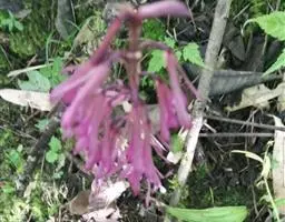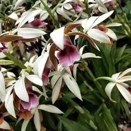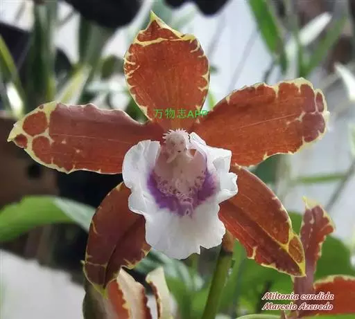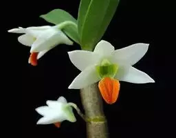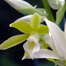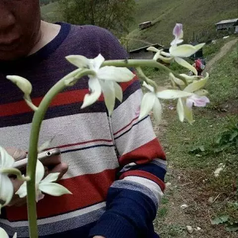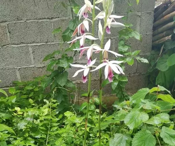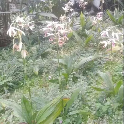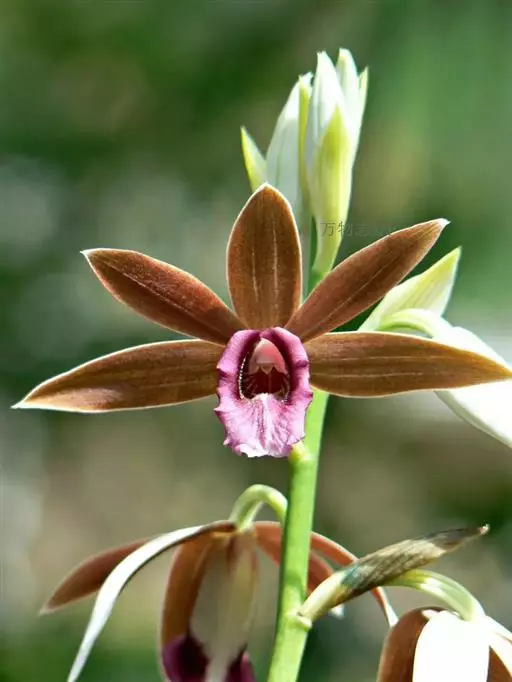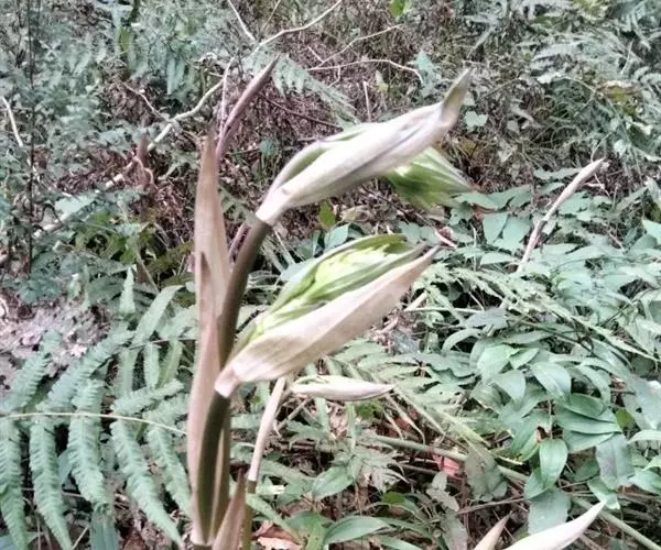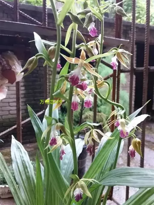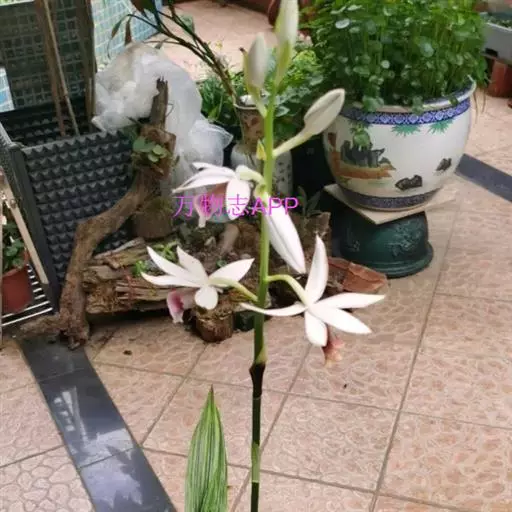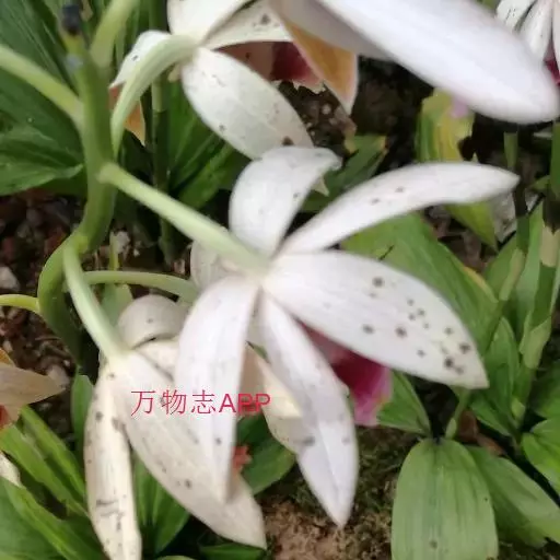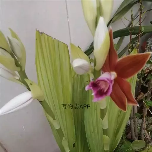 鹤顶兰(学名:Phaius tankervilleae (Banks ex L'Herit. ) Bl.):植物体高大。假鳞茎圆锥形,长约6厘米或更长。叶2-6枚,互生于假鳞茎的上部,长圆状披针形,两面无毛。花葶从假鳞茎基部或叶腋发出,直立,圆柱形,长达1米,粗约1厘米,疏生数枚大型的鳞片状鞘,无毛;总状花序具多数花;花大,美丽,背面白色,内面暗赭色或棕色,直径7-10厘米;花瓣长圆形,与萼片等长而稍狭,先端稍钝或锐尖,具7条脉,但近边缘的脉分枝,无毛;唇瓣贴生于蕊柱基部,背面白色带茄紫色的前端,内面茄紫色带白色条纹,摊平后整个轮廓为宽菱形或倒卵形,比萼片短,宽3-5厘米,中部以上浅3裂。花期3-6月。