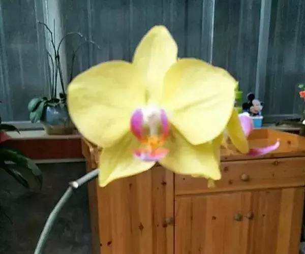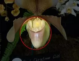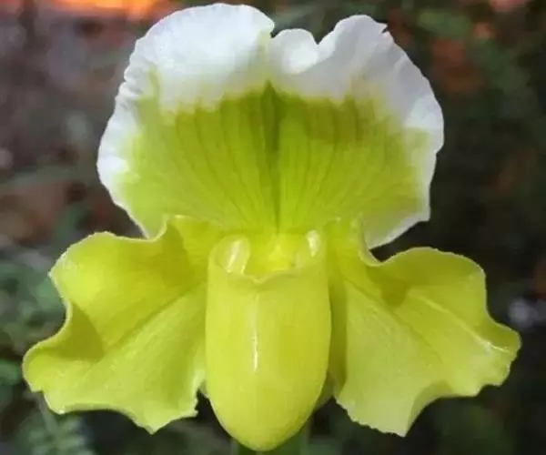 花葶直立,长15-28厘米,淡紫红色与绿色相间,被褐色短毛,顶端生1花;花苞片卵状披针形或卵形,长1.3-1.8厘米,淡绿黄色并有紫红色斑点,稍被毛;花梗和子房长3.5-4厘米,被白色短柔毛;子房有6条钝的纵棱;花大,直径7-9厘米,纯黄色,仅退化雄蕊上有浅栗色纵纹;中萼片卵形或卵状披针形,长2.2-4.8厘米,宽1.4-2.2厘米,先端近急尖,背面近顶端与基部具长柔毛,边缘具缘毛;合萼片与中萼片相似,长2-3.5厘米,宽1.2-2厘米,先端钝而不裂,背面具长柔毛并有2条钝的龙骨状突起,边缘具缘毛;花瓣大,宽卵状椭圆形、宽卵形或近圆形,长2.8-5.3厘米,宽2.5-4.8厘米,先端急尖或近浑圆,内表面基部具白色长柔毛,边缘具缘毛;唇瓣深囊状,近椭圆状球形或宽椭圆形,长4-5厘米,宽3.5-4厘米,基部具短爪,囊口近圆形,整个边缘内折,但先端边缘较狭窄,囊底有白色长柔毛和紫色斑点;退化雄蕊宽卵形或卵圆形,长1-2厘米,宽1-1.5厘米,先端急尖,背面具钝的龙骨状突起。花期2-4月。