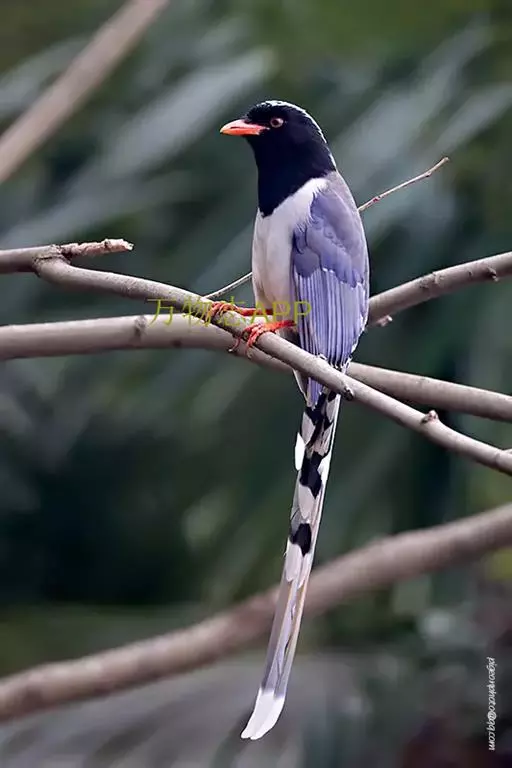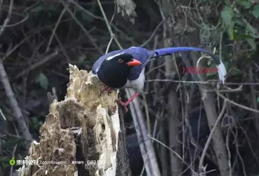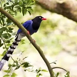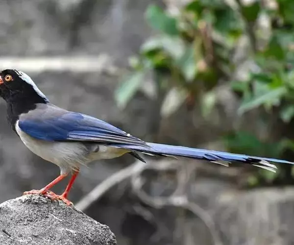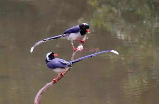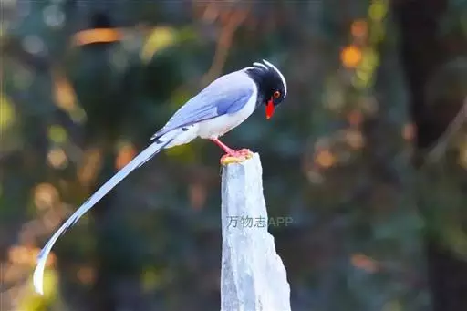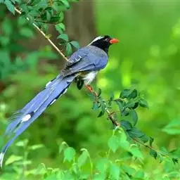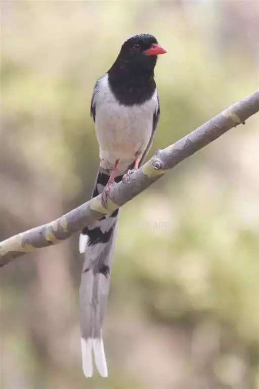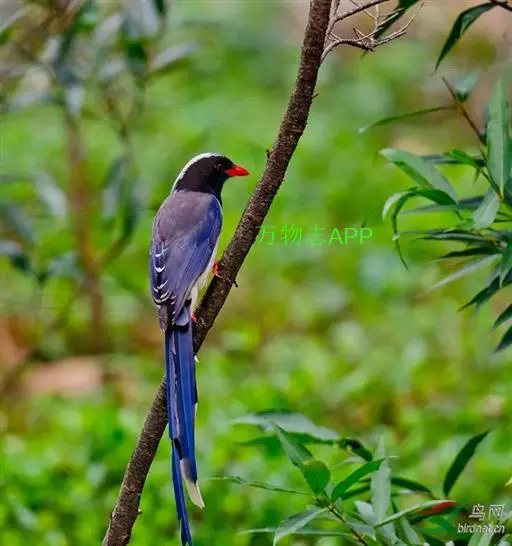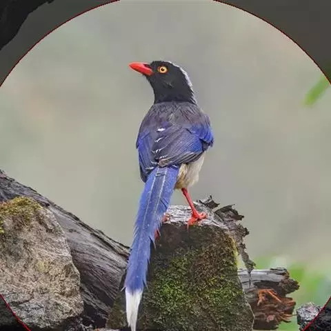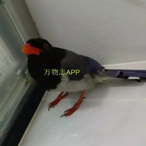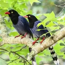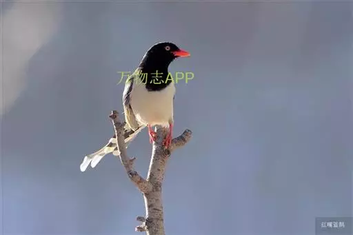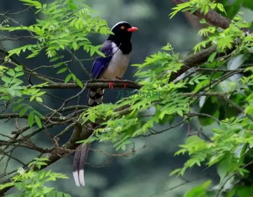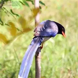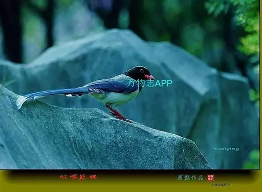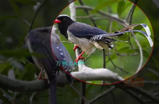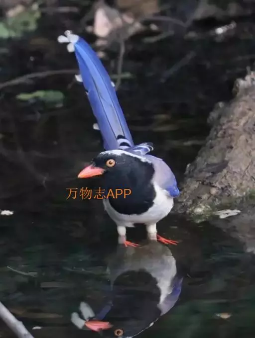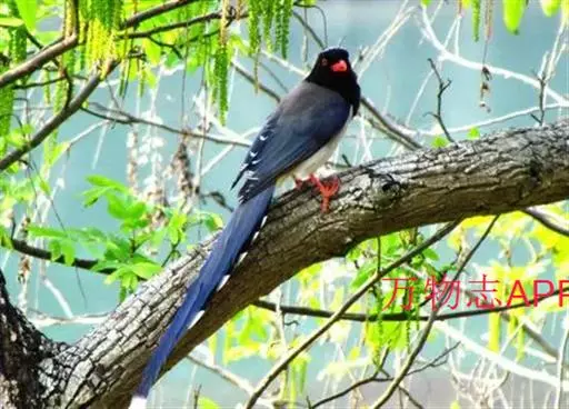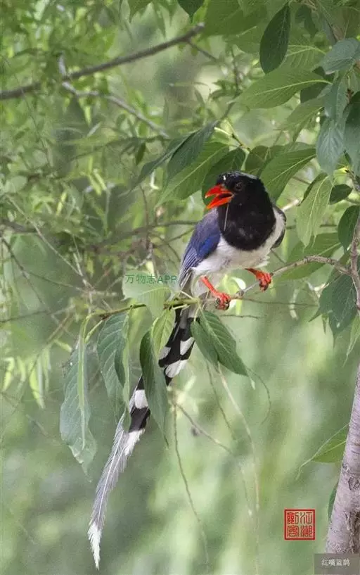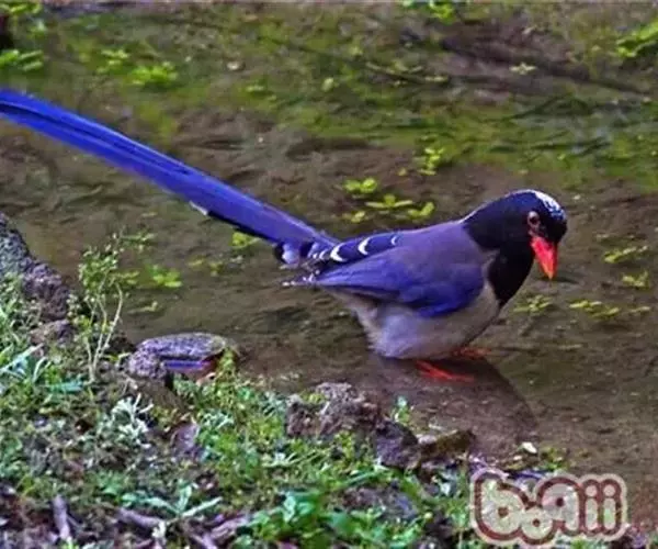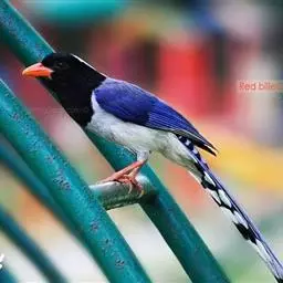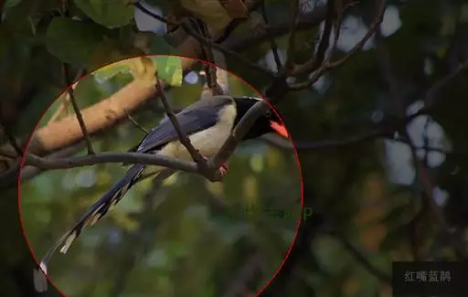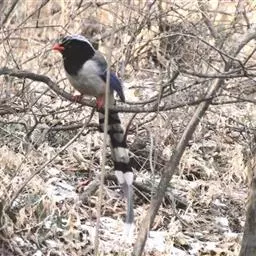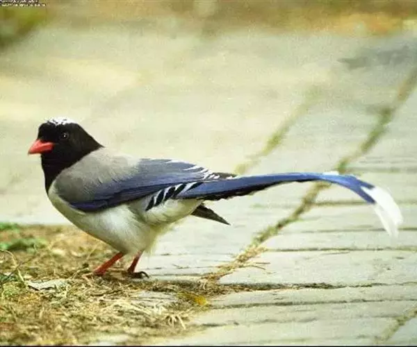 红嘴蓝鹊(学名:Urocissa erythrorhyncha) :是大型鸦类,体长54-65厘米。嘴、脚红色,头、颈、喉和胸黑色,头顶至后颈有一块白色至淡蓝白色或紫灰色块斑,其余上体紫蓝灰色或淡蓝灰褐色。尾长呈凸状具黑色亚端斑和白色端斑。下体白色。 黄嘴蓝鹊外形和羽色和该种非常相似,但黄嘴蓝鹊嘴为黄色,头部仅枕有白色块斑。区别仍很明显,野外不难识别。