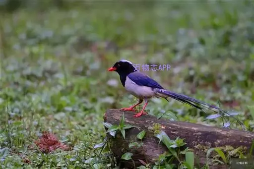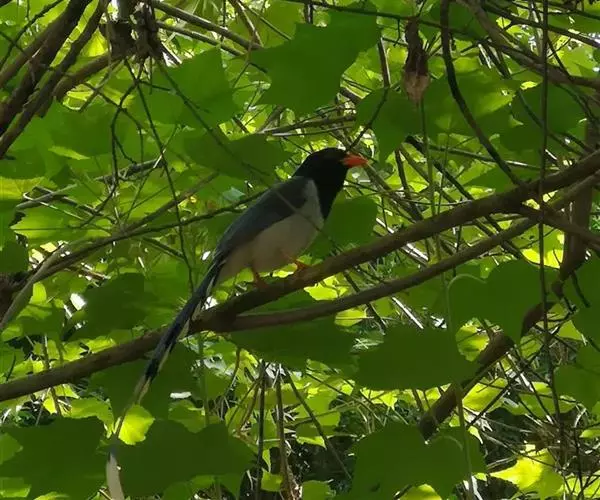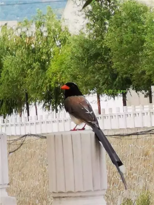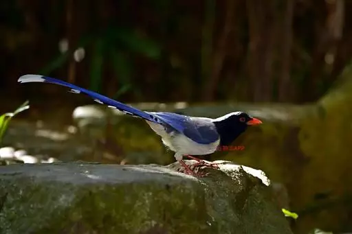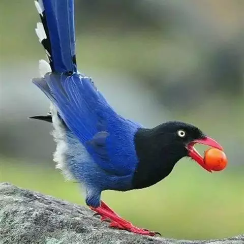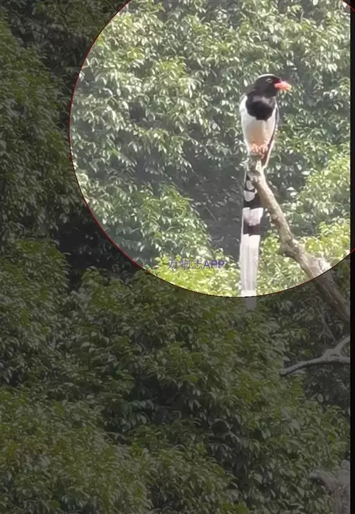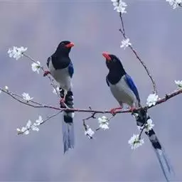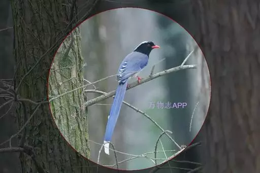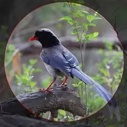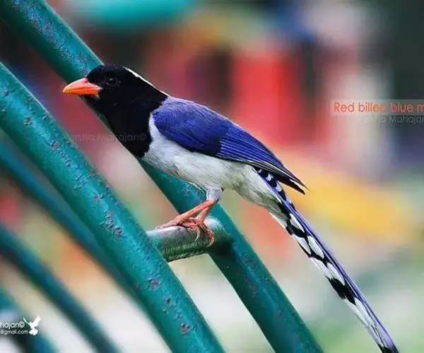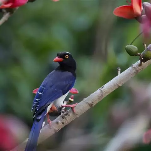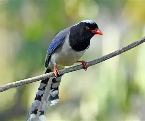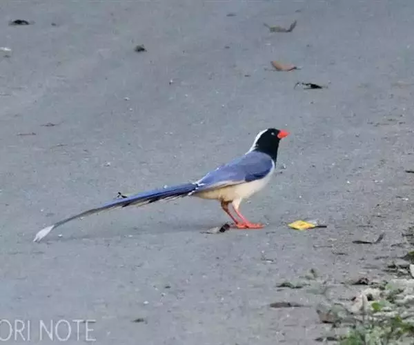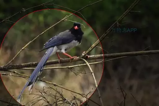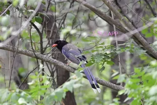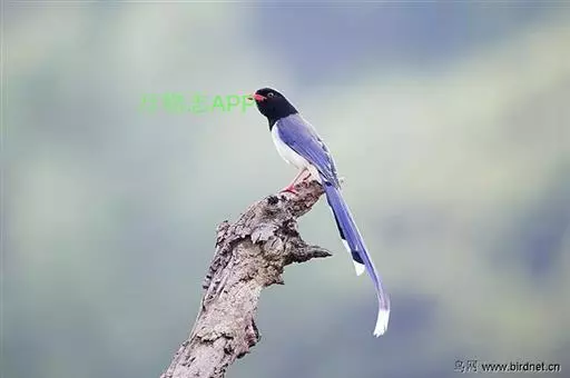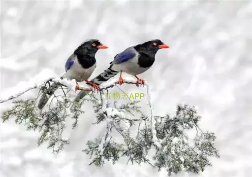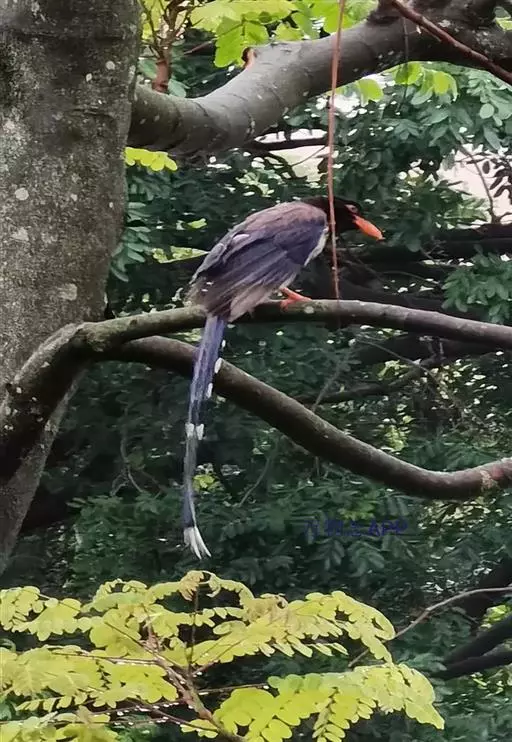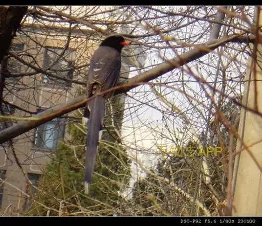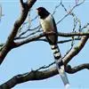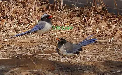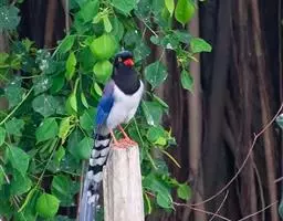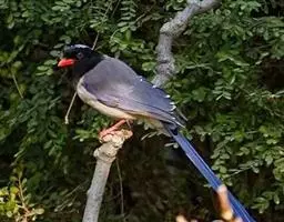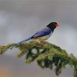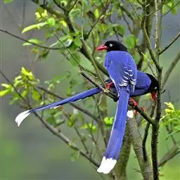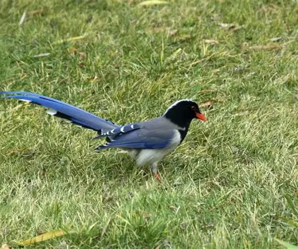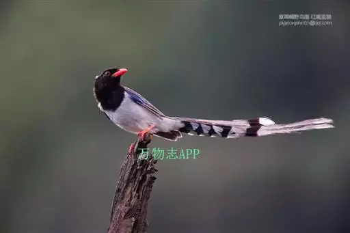 红嘴蓝鹊(学名:Urocissa erythrorhyncha) :是大型鸦类,体长54-65厘米。嘴、脚红色,头、颈、喉和胸黑色,头顶至后颈有一块白色至淡蓝白色或紫灰色块斑,其余上体紫蓝灰色或淡蓝灰褐色。尾长呈凸状具黑色亚端斑和白色端斑。下体白色。 黄嘴蓝鹊外形和羽色和该种非常相似,但黄嘴蓝鹊嘴为黄色,头部仅枕有白色块斑。区别仍很明显,野外不难识别。